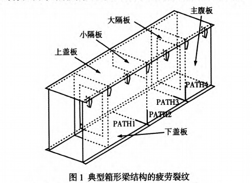 通過對在役橋門式起重機的實際檢測和疲勞試箱形梁結(jié)構(gòu)的高發(fā)性疲勞裂紋,主要發(fā)生在下蓋板與主腹板間的縱向受拉翼緣焊縫和大隔板與主腹板連接焊縫下端的焊趾處,其疲勞裂紋萌生源和擴展機理,如表1所示。]