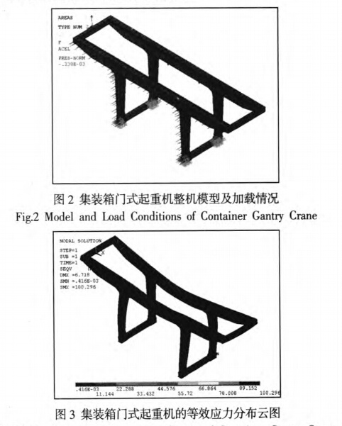 某鐵路局36t集裝箱門式起重機結(jié)構(gòu)主要參數(shù)為跨度18m,懸臂長12.5m,小車軸距8.6m。利用ANSYS及其參數(shù)化設(shè)計語言(APDL),采用sheU63單元,建立起重機整體結(jié)構(gòu)的參數(shù)化模型。將小車位于跨中,起升機構(gòu)滿載提升考慮沖擊載荷)時,作為研究跨間裂紋的最危險工況。同時考慮結(jié)構(gòu)自重、風(fēng)載、大車運行偏斜側(cè)向力等的作用,起重機整機模型及此工況下的加載情況,如圖2所示。在跨中工況下,整機結(jié)構(gòu)的等效應(yīng)力云圖,如圖3所示。